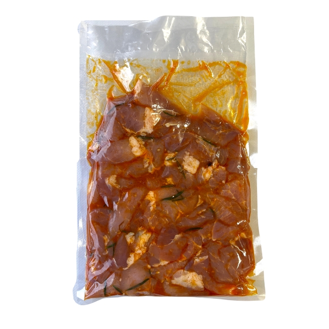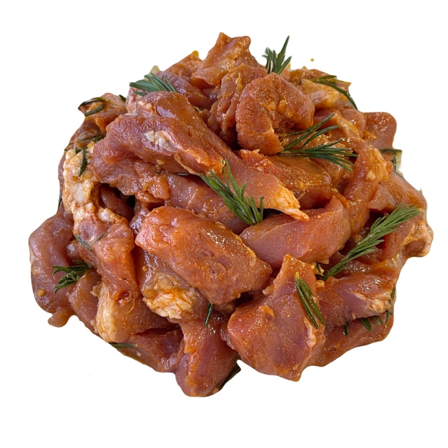 Состав: Полуфабрикат мясной мелкокусковой бескостный из свинины Состав:лопаточная часть свиная,розмарин свежий,масло подсолнечное рафинированное,соль пищевая поваренная йодированная,паприка красная,чеснок сушеный,кориандр молотый, перец черный молотый.