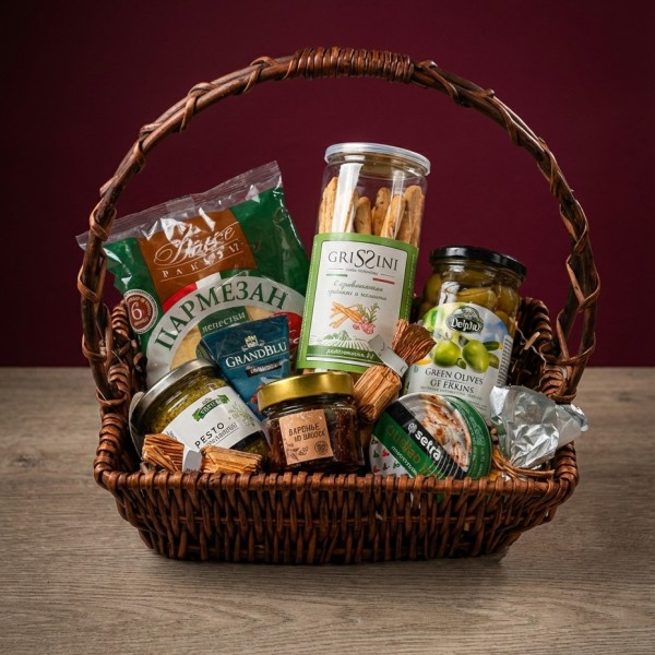 В составе набора: Сыр DOLCE GRANTO лепестки 150 г, Сыр Интенс GRANDBLU 100 г, Палочки хлебные "Гриссини" с прованскими травами и чесноком 140 г, Соус Песто "MONTI" 180 г, Паштет из куриной печени SETRA 100 г, Оливки без косточек в рассоле Delphi 350 г, Конфета CAMELIA (молочная глазурь с начинкой капучино) БРОНЗА 16 г, Конфета GOLDEN DREAM (молочный шоколад с начинкой пралине фундук) СЕРЕБРО 24 г, Варенье из инжира стерилизованное "BIZIM TARLA" 400 г, Корзина.