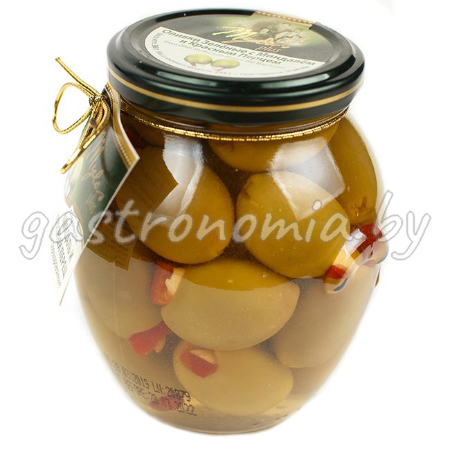 Состав: Оливки зелёные, красный перец, миндаль, вода, соль, регулятор кислотности: Е330, Е270.