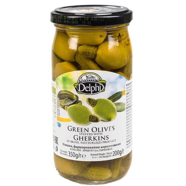 Оливки с косточкой Delphi, фаршированные корнишонами, обладают отчетливым вкусом и фирменным горьковатым послевкусием. Мякоть оливок, собранных в Северной и Центральной Греции, чуть жестче, чем у черных оливок и они обладают отчетливым вкусом и фирменным горьковатым послевкусием.