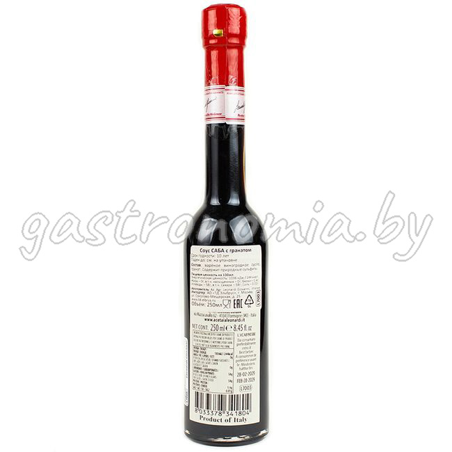 Соус САБА "Leonardi" с гранатом, в стеклянной бутылке, объём 250 мл. Leonardi - это изысканные бальзамические соусы и уксусы из Италии. Семья Леонарди несколько поколений создает настоящий бальзамик. Производство находится в итальянской провинции Модена. С 2000 года имеет статус DOP (защищенное обозначение происхождения). Идеально подходит для салатов, свежих и отварных овощей, мяса на гриле, рыбы, маринадов, винегретов, соусов.