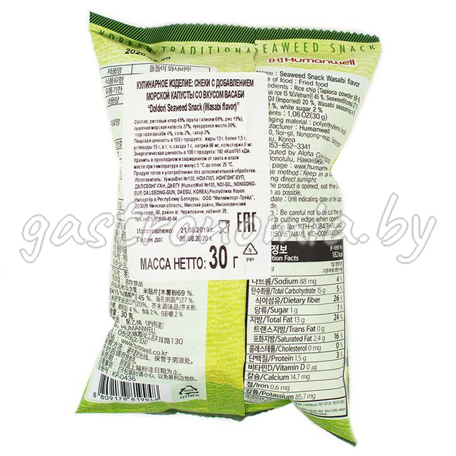 Кулинарное изделие: СНЕКИ с добавлением морской капусты со вкусом васаби "Doldori Seaweed Snack (Honey butter flavor) "