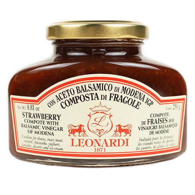 Приправа из клубники с бальзамическим уксусом из Модены "Leonardi" напоминающая по виду варенье-конфитюр из клубники бальзамическая компоста Леонарди имеет исключительный вкус и её можно употреблять как самостоятельно,