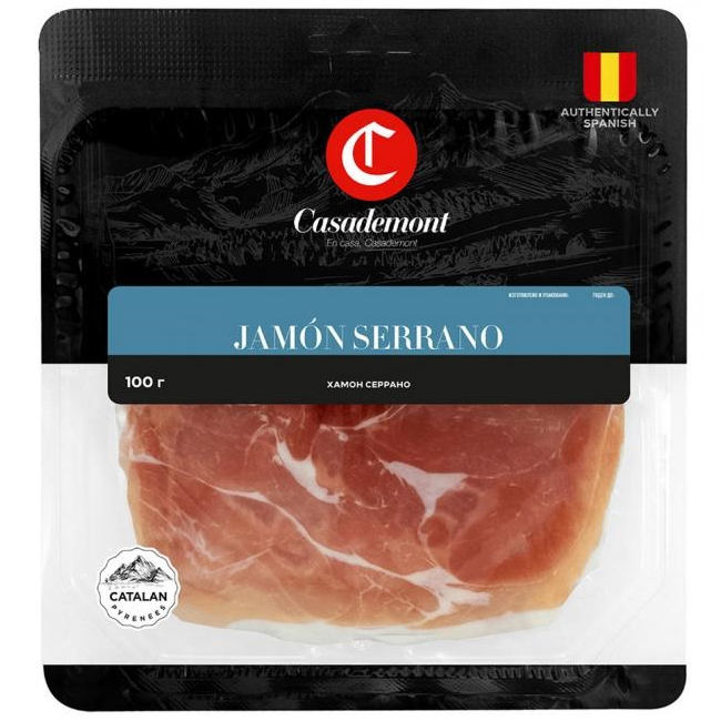 Традиционный испанский сыровяленый продукт из свиней белой породы, который высоко ценится гурманами по всему миру. Секрет Хамона Серрано Casademont заключается в тщательном отборе окороков и уникальном процессе вяления (не менее 7 месяцев), в результате которого создается исключительный продукт. Хамон Серрано великолепно подходит для приготовления закусок «тапас», особенно удобно это при варианте продукта в нарезке.