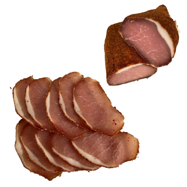 Сыровяленный мясной деликатес из свиной корейки в пряной паприке, чесноке и кориандре с пикантной ноткой и легкой остринкой.