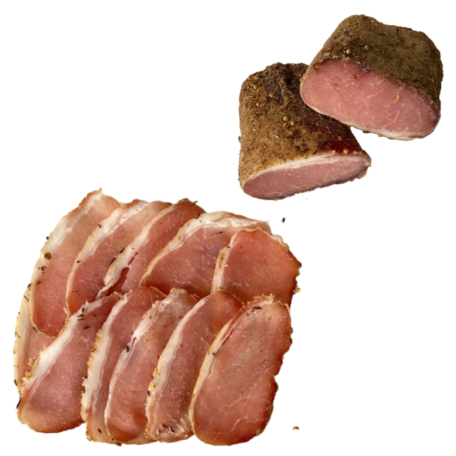 Состав: спинно-поясничная часть свиная,смесь посолочно-нитритная Универсальная с йодом(соль пищевая выварочная, консервант и фиксатор окраски-нитрит натрия,агент антислеживающий Е536,йодат калия),соль поваренная пищевая йодированная (агент антислеживающий Е536,йодат калия),приправа Хуторянская(специи(тмин,перц черный,кориандр,лавровый лист),сушеные овощи(лук,чеснок),кумин молотый,тимьян сушеный.