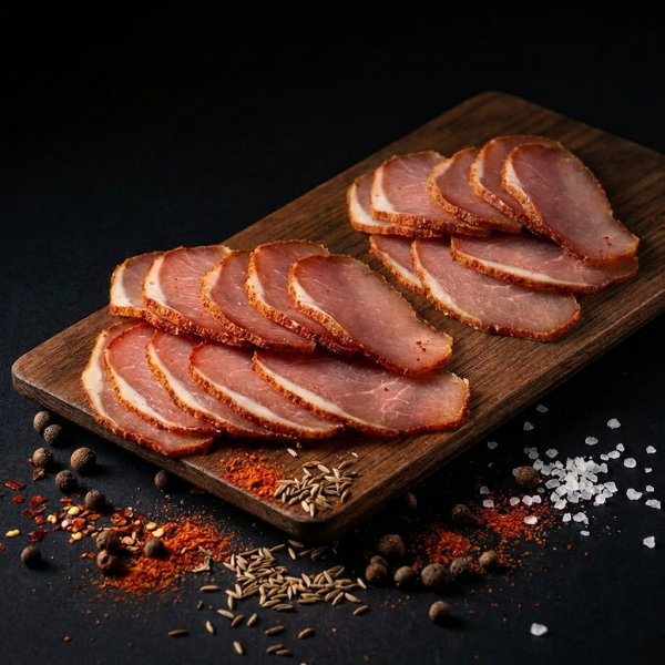 Состав: спинно-поясничная часть свиная,смесь посолочно-нитритная Универсальная с йодом(соль пищевая выварочная, консервант и фиксатор окраски-нитрит натрия,агент антислеживающий Е536,йодат калия),соль поваренная пищевая йодированная (агент антислеживающий Е536,йодат калия),приправа Хуторянская(специи(тмин,перц черный,кориандр,лавровый лист),сушеные овощи(лук,чеснок),кумин молотый,тимьян сушеный.