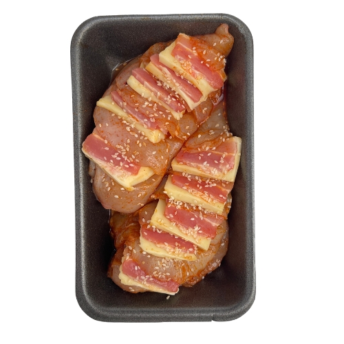 Состав: Кулинарный полуфабрикат. Состав:филе цыпленка-бройлера, бекон копчено-вареный, сыр Моцарелла (изготовлен из молока коровьего нормализованного с использованием сухой лиофизированной заквасочной культуры, уплотнитель хлорид кальция, ферментный препарат животного происхождения-химозин, пепсин), масло подсолнечное рафинированное, соль пищевая поваренная йодированная, кунжут семена, паприка копченая, перец белый молотый