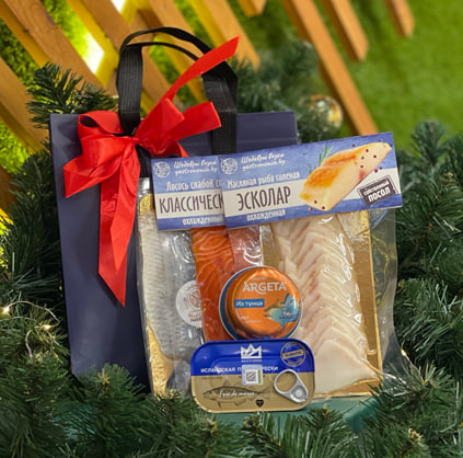 Подарочный набор в составе: Ассорти нарезка по 100 г масляная и красная рыбы, Паштет из тунца 95 г, Филе тихоокеанской сельди соленое 200 г, Печень трески 115 г, Термосумка с хладоэлеменатми.