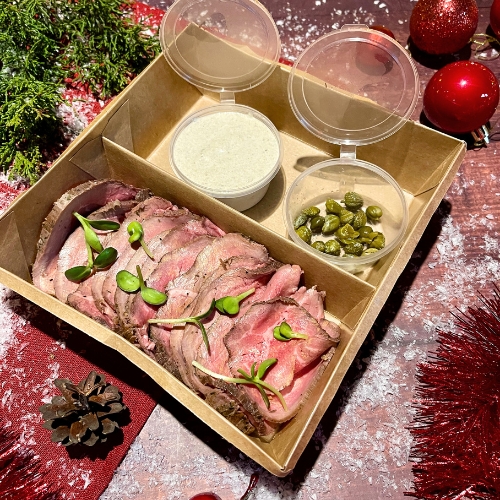 Состав: Филей наружней части бедра говяжий, майонез, тунец су-вид, вода питьевая, филе анчоуса, масло оливковое, каперсы в рассоле (каперсы, вода, соль. уксус. лимонная кислота), соль поваренная йодированная (содержит йодат калия, агент антислеживающий Е536), смесь прованские травы, перец черный молотый, микрозелень.