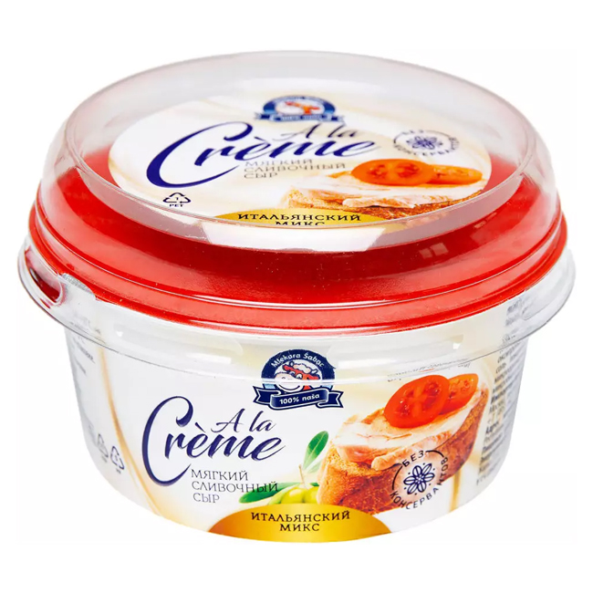 Сливочный мягкий сыр A la Creme «Итальянский микс»  от бренда Mlekara Sabac подходит для приготовления разнообразных горячих и холодных закусок. В состав продукта входят качественные ароматные ингредиенты: вяленые томаты, орегано, тимьян, паприка и чеснок. Вам удастся приготовить очень вкусный завтрак, намазав этот сыр на хрустящий поджаренный хлеб.